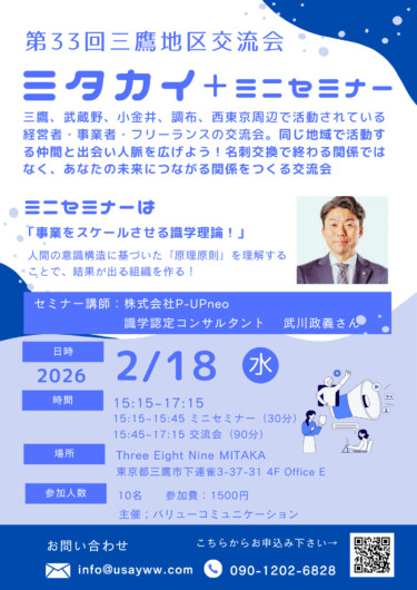 主催;バリューコミュニケーション 渡辺 靖仁(三鷹市倫理法人会所属)